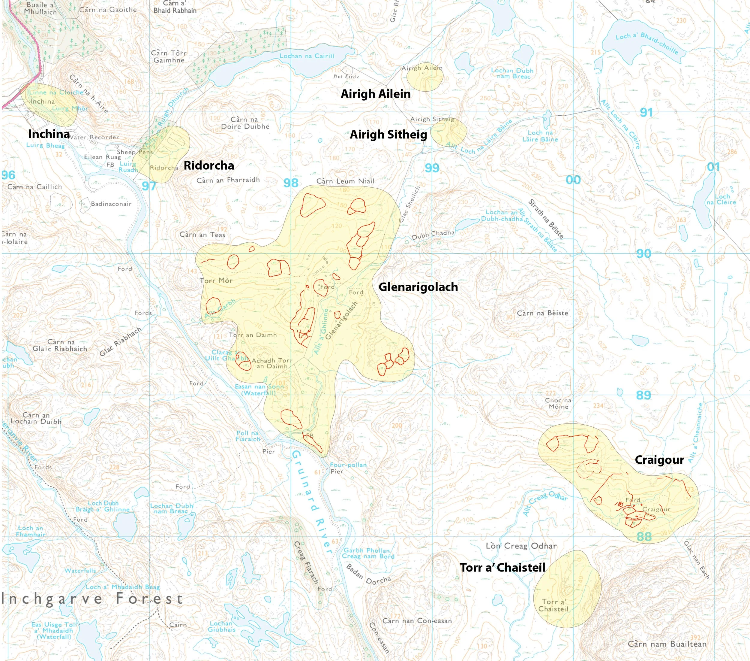 This is a huge & complex multi-period farming landscape, ranging from BA/IA features to pre-crofting structures and also a later sheep farm at Craigour (A’ Chreag Odhar).