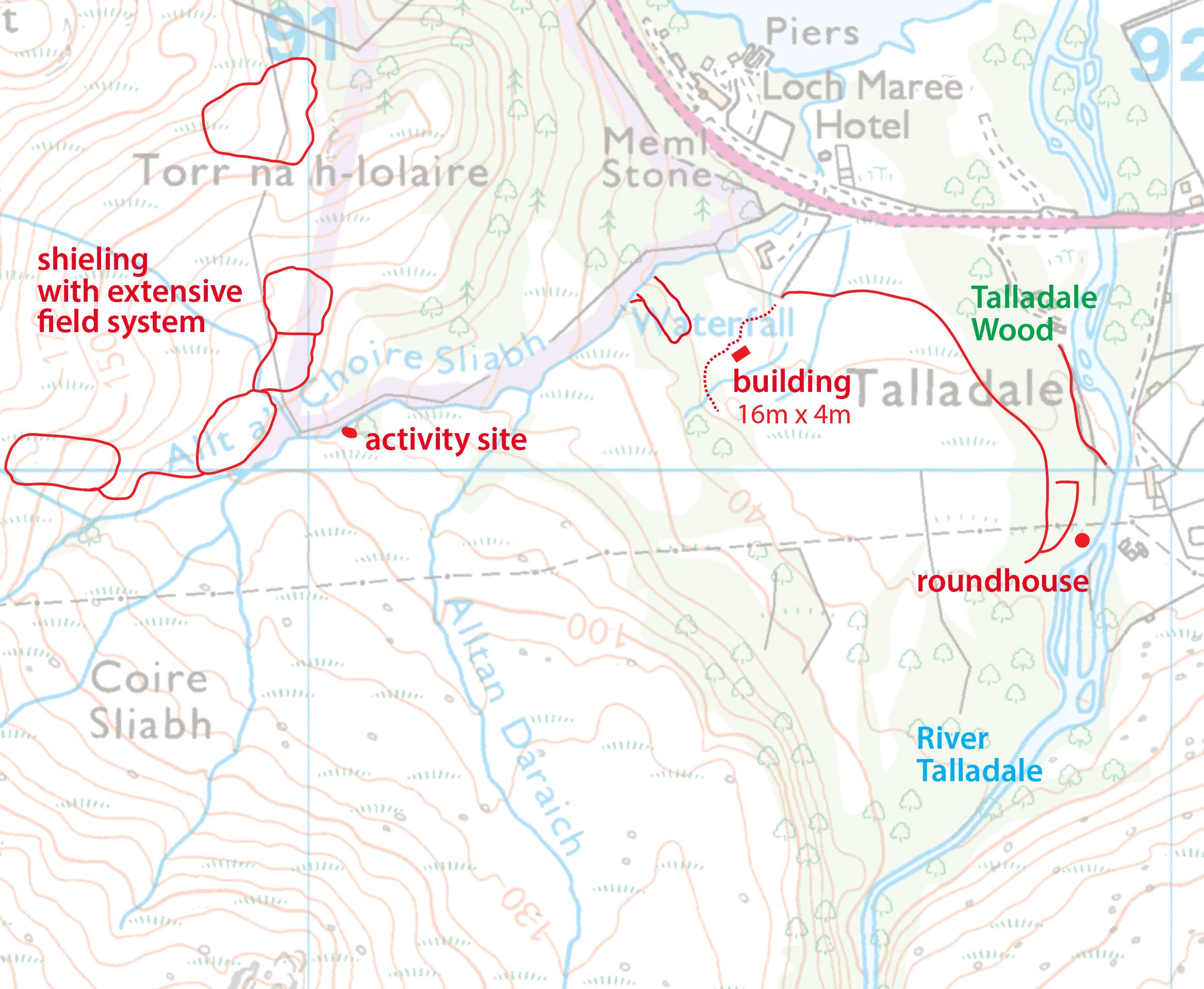 features : roundhouse, shieling, field system, enclosures, walls, dykes, longhouse, still