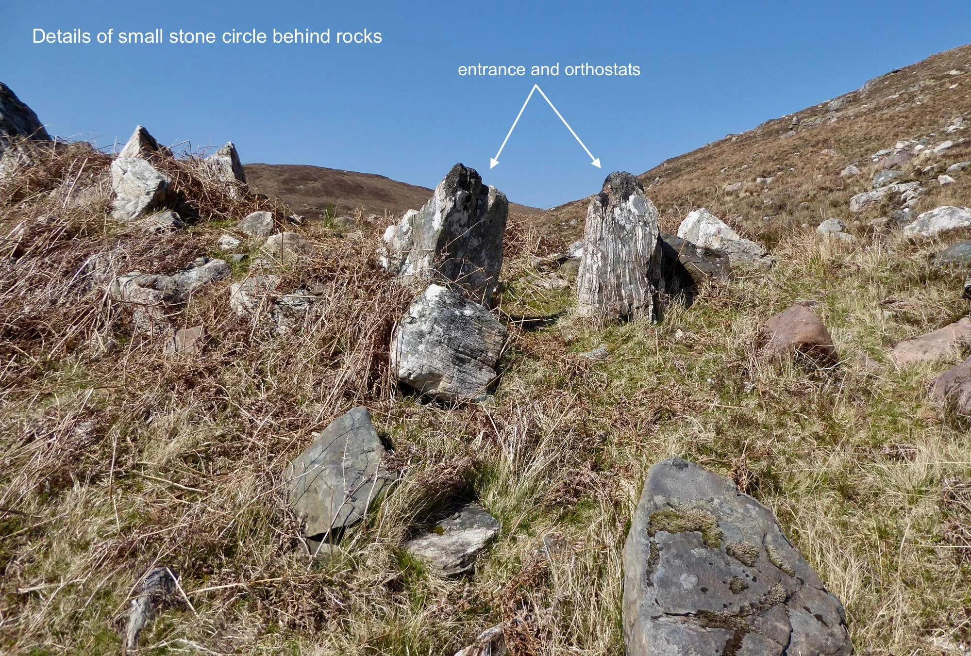 From below, the jumble of huge rocks looks very imposing and the small circle of stones (4m diam) hidden behind it seems to have been constructed more elaborately than is necessary.